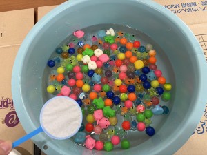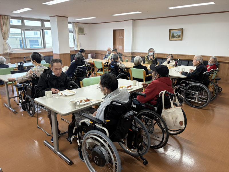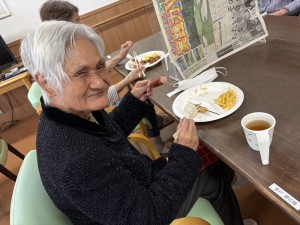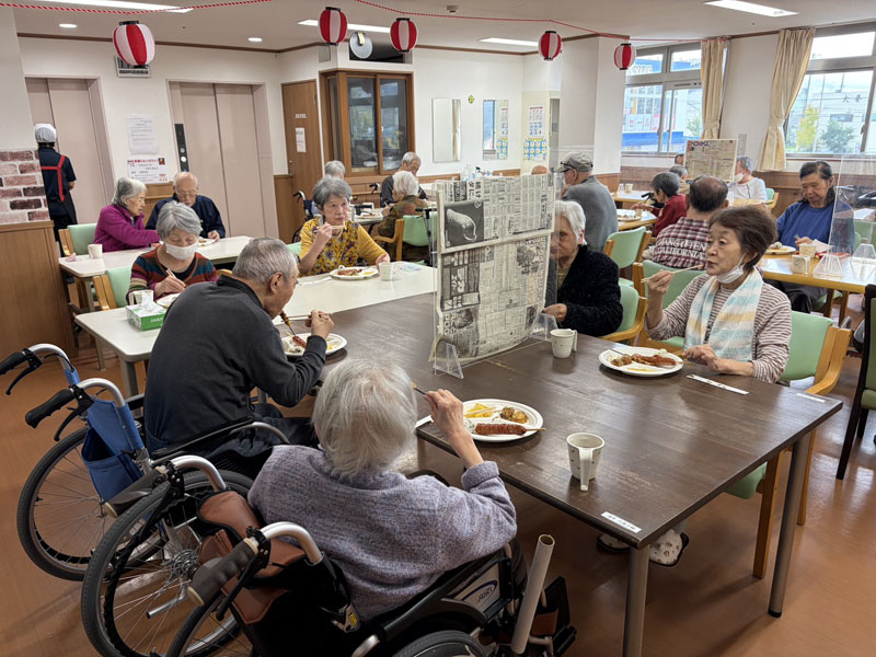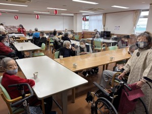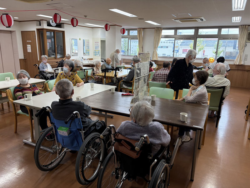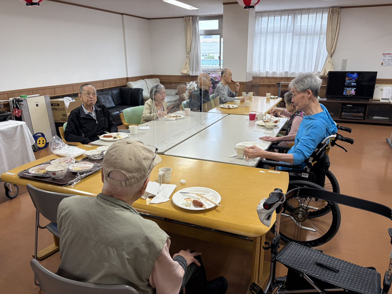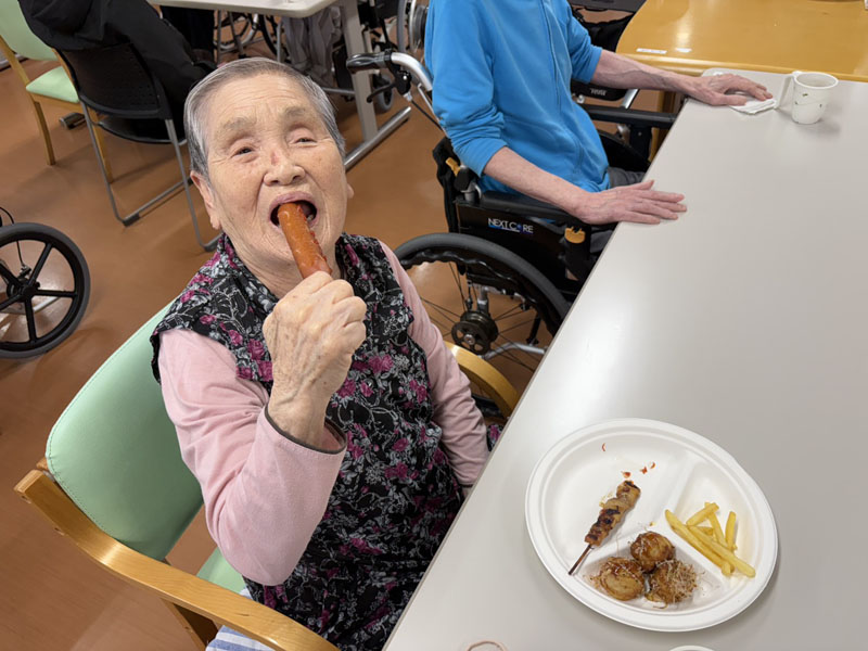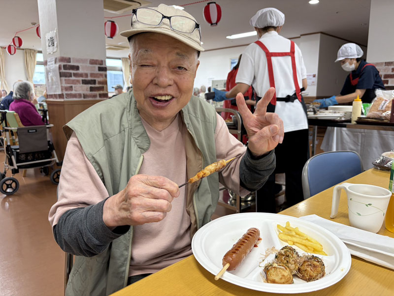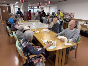 お昼ご飯は屋台風に、普段とは違った感じで楽しんでいただき、その後スーパーボールすくい、輪投げを楽しみ、特に輪投げは、景品のお菓子を狙い、なかなか気合の入った様子で、楽しい一日を過ごしていただけたかと思います。
